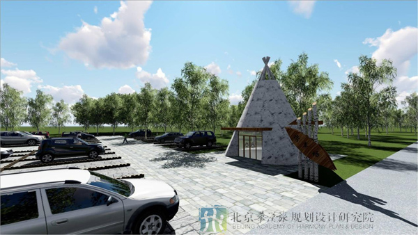 入口利用场地内树木稀少的现状,打造白桦林下自然生态景观停车场,保护并凸显规划区域内白桦与松树缠绕互生的奇特景观,并规划设置综合管理服务、进入指示标志和卫生间等项目。