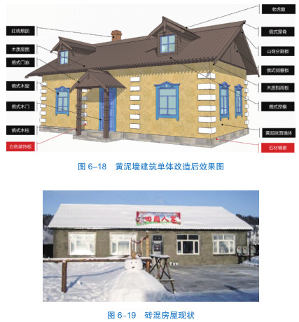 墙面的改造设计也分为两类:一类是原有的黄泥抹面墙体,只对残破部位加以修补,通过门窗改造改变风貌(如图 6-17 所示为改造前,图 6-18 所示为改造后)。另一类是原有的砖混房子,将原木干挂形式提升为木刻楞风格(如图 6-19 所示为改造前,图 6-20 所示为改造后)。