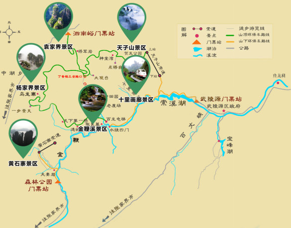 ——公园分区:金鞭溪景区、杨家界景区、黄石寨景区、袁家界景区、天子山景区、十里画廊景区。