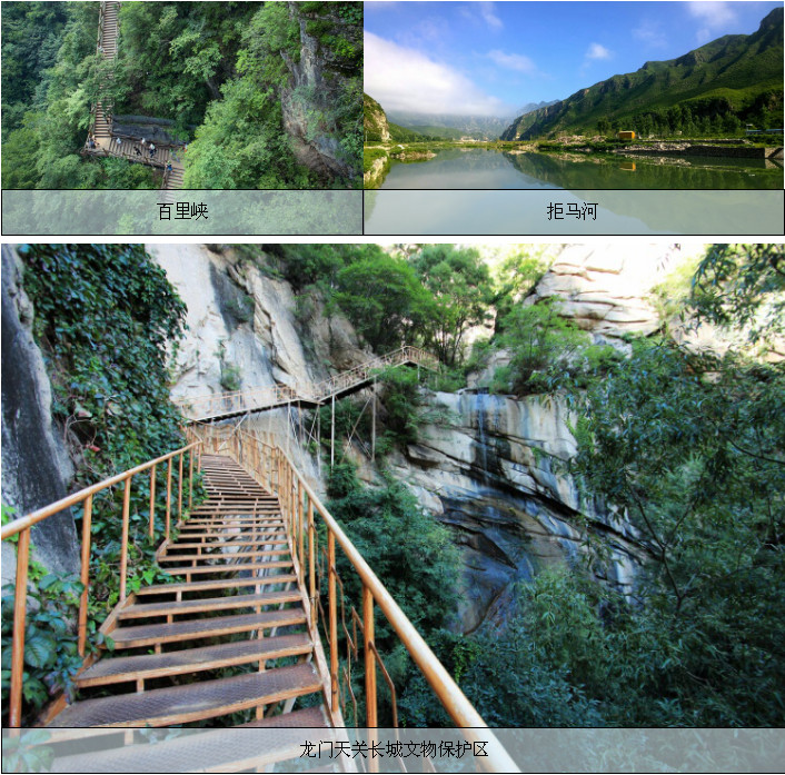 ——功能分区:主要分为百里峡峡谷风光游览区、拒马河避暑疗养游乐区、佛洞塔奇泉怪洞游览区、龙门天关长城文物保护区、白草畔原始森林保护区及金华山寻奇狩猎区,6个景区内分布着199个景点。